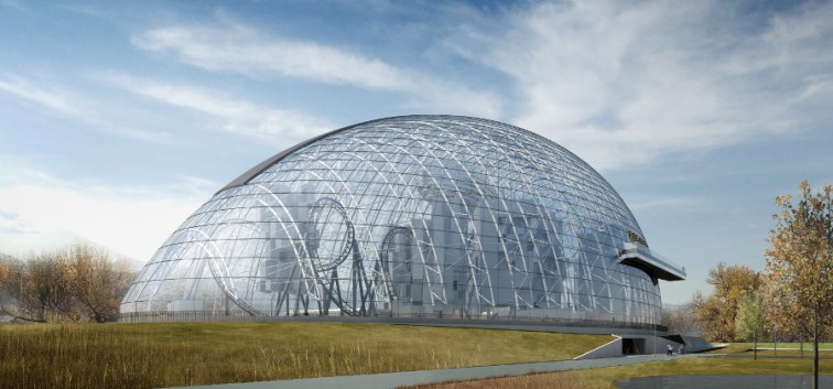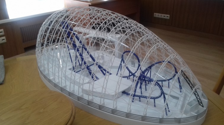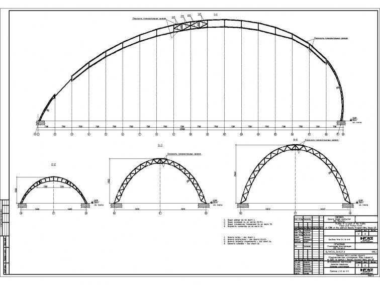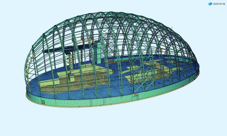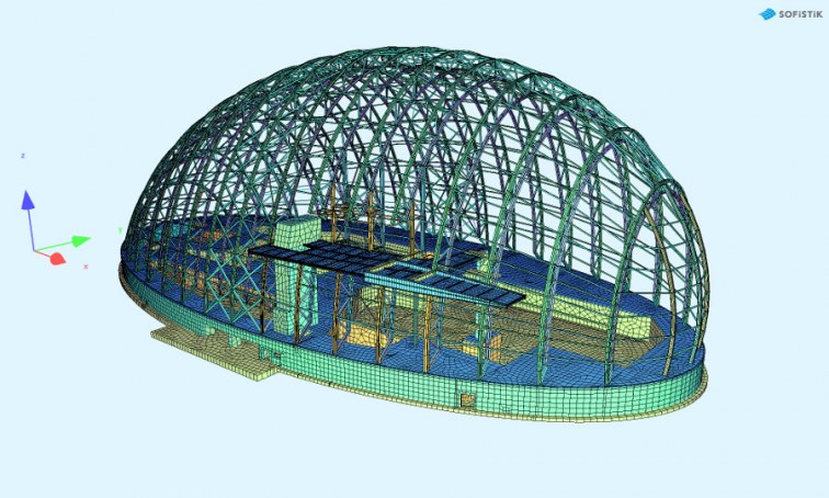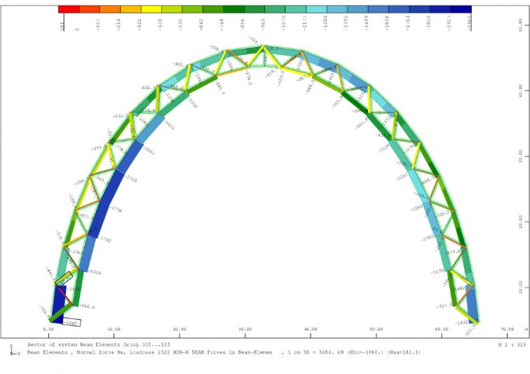 Конструкция павильона решена с помощью системы металлических двухшарнирных арок сквозного сечения. Высота арок достигала 45 метров, максимальный пролет – 66 метров. Определенный вызов для инженеров Инфорспроекта представляло обеспечение пространственной работы всех арок с учетом температурных и ветровых воздействий, для чего была разработана специальная система связей.